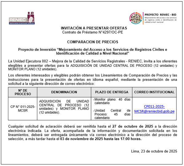 SERVICIO DE ACONDICIONAMIENTO E IMPLEMENTACIÓN DE 08 CENTROS DE IMPRESIÓN DEL DNI ELECTRÓNICO EN CENTROS DE SERVICIOS – ZONA I Y II (INCLUYE ELABORACIÓN DE EXPEDIENTE TÉCNICO)